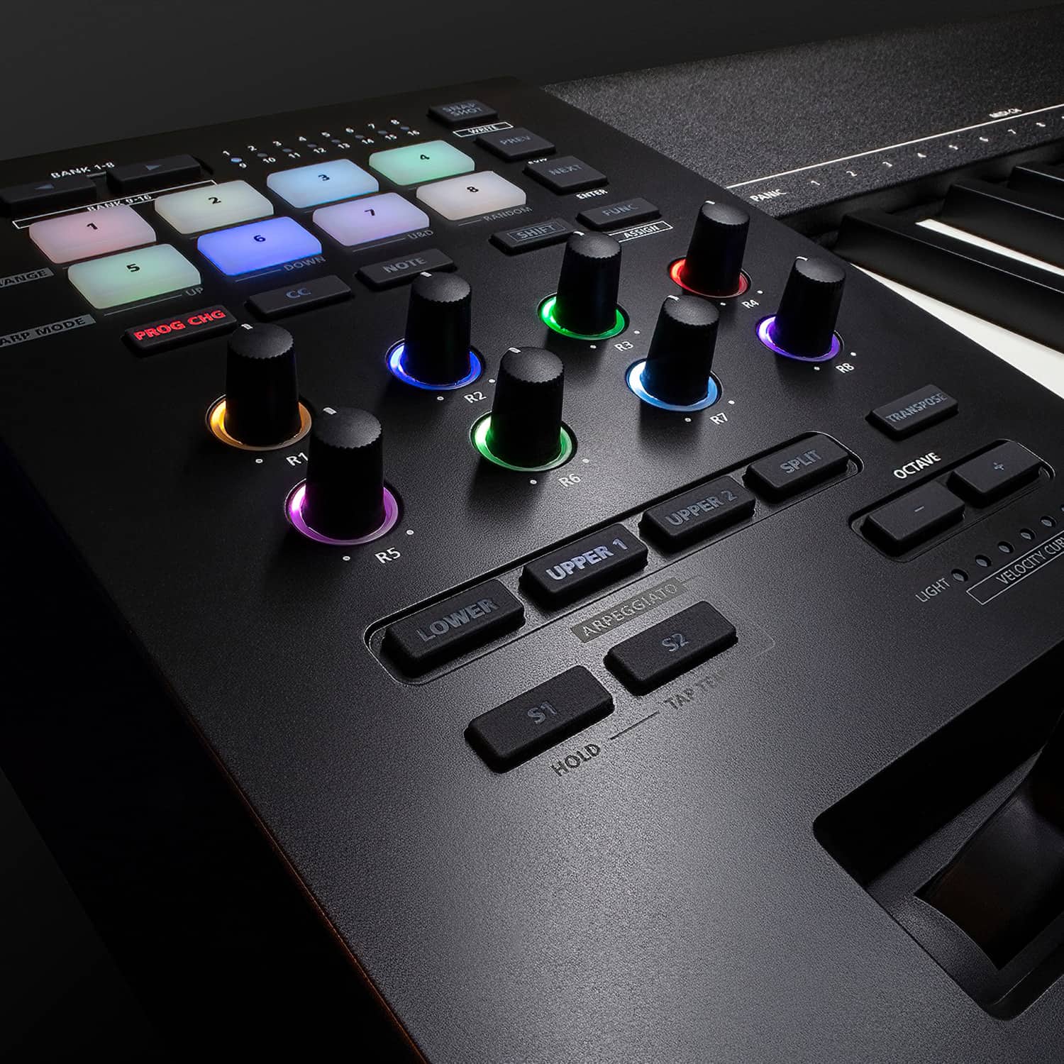 As far as practical onboard features go, the A-88MKII offers 3 customizable zones, allowing you to split and layer the entire range of keyboard however you choose. Roland’s pitch/mod switch, along with an arsenal of RGB-lit knobs and pads offers a host of real-time control. Add in an input specifically for a sustain pedal as well as two additional fully assignable pedal inputs whatever pedal setup the production calls for.